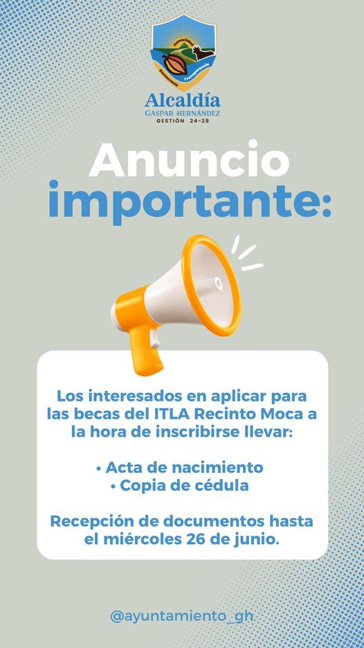 Las personas interesadas en aplicar para las becas del ITLA Recinto Moca deben presentar al momento de inscribirse los siguientes documentos en las oficinas del ayuntamiento municipal: