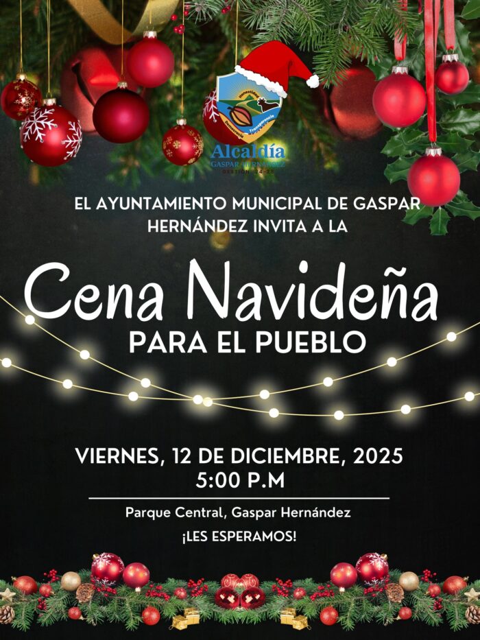 El Ayuntamiento Municipal de Gaspar Hernández tiene el honor de invitar a toda el pueblo a disfrutar de una hermosa Cena Navideña para el Pueblo, un encuentro preparado con cariño para compartir la alegría, la unión y el espíritu festivo que nos regala esta temporada. Les esperamos este viernes 12 de diciembre a las 5:00 p.m. en el Parque Central, para vivir juntos una noche especial en familia. ¡No falten! ![]()