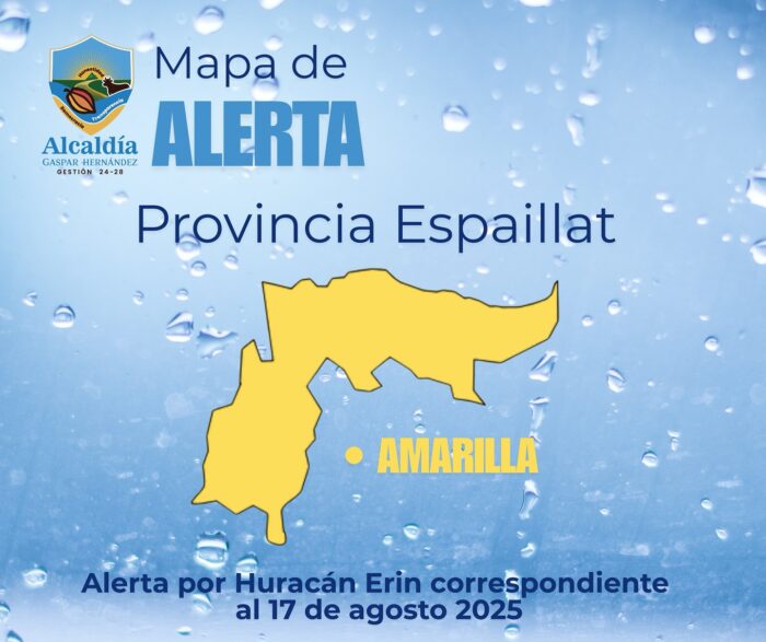 El COE coloca a la provincia Espaillat en alerta amarilla debido a que el informe del INDOMET, establece que el poderoso huracán Erin, categoría 5, provocará un cielo nublado en ocasiones con aguaceros locales, tormentas eléctricas, ráfagas de viento y oleaje peligroso, sobre provincias de la costa norte del país.