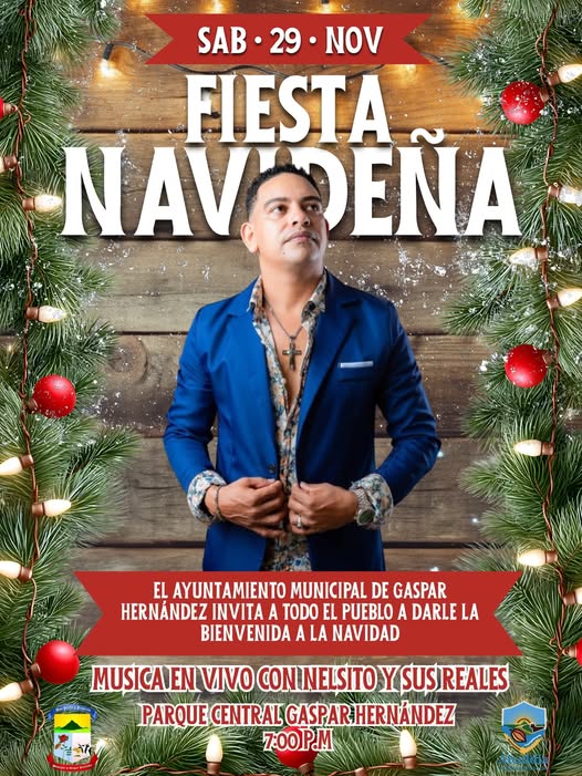 El Ayuntamiento Municipal de Gaspar Hernández invita a toda la comunidad a disfrutar una gran Fiesta Navideña este sábado 29 de noviembre, a partir de las 7:00 p.m. en el Parque Central. Ven a compartir en familia y dar juntos la bienvenida a la Navidad con música en vivo de Nelsito y sus Reales, un ambiente festivo y lleno de alegría para todos. ¡Te esperamos!
