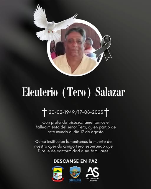 El Ayuntamiento Municipal de Gaspar Hernández expresa su más profundo pesar por el lamentable fallecimiento de Eleuterio Salazar cariñosamente Tero.