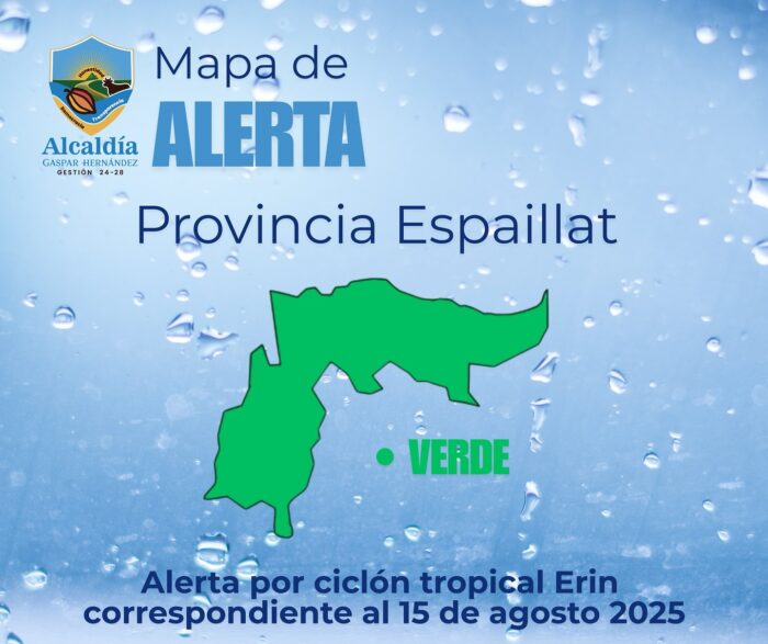 El COE declara la provincia Espaillat en alerta verde, debido a que el informe del INDOMET, establece que para mañana sábado, de acuerdo con la trayectoria pronosticada del ciclón tropical Erin, este continuará desplazándose hacia el oeste/noroeste sobre aguas abiertas del Atlántico, con su centro pasando a cientos de kilómetros al noreste de Puerto Rico y la República Dominicana.