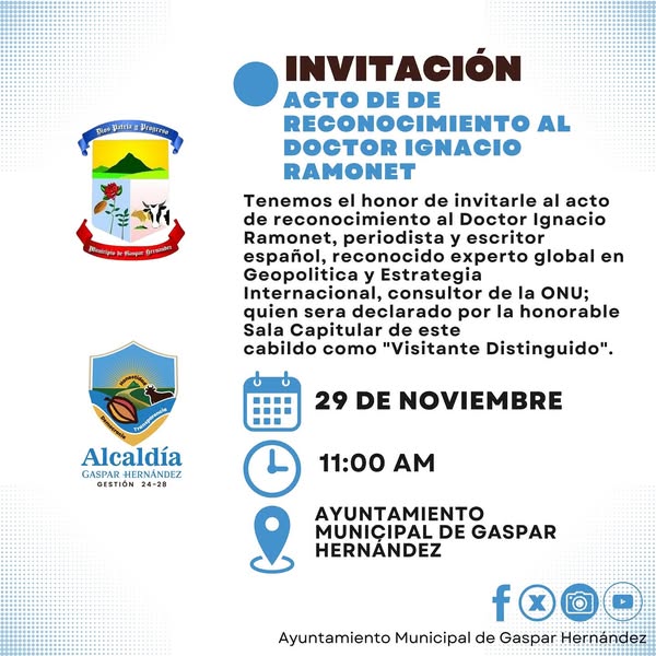 El Ayuntamiento Municipal tiene el honor de invitarle al acto de reconocimiento al Doctor Ignacio Ramonet, periodista y escritor español, reconocido experto global en Geopolitica y Estrategia Internacional, consultor de la ONU; quien sera declarado por la honorable Sala Capitular de este cabildo como “Visitante Distinguido”.