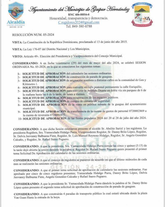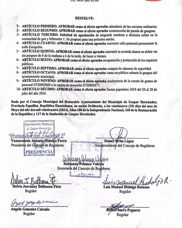 Dada por el Concejo Municipal del Honorable Ayuntamiento del Municipio de Gaspar Hernández, Provincia Espaillat, República Dominicana, en sesión ordinaria, a los veintinueve (29) días del mes de mayo del año dos mil veinticuatro (2024), Año 180 de la Independencia Nacional, 160 de la Restauración de la Republica y 117 de la fundación de Gaspar Hernández.